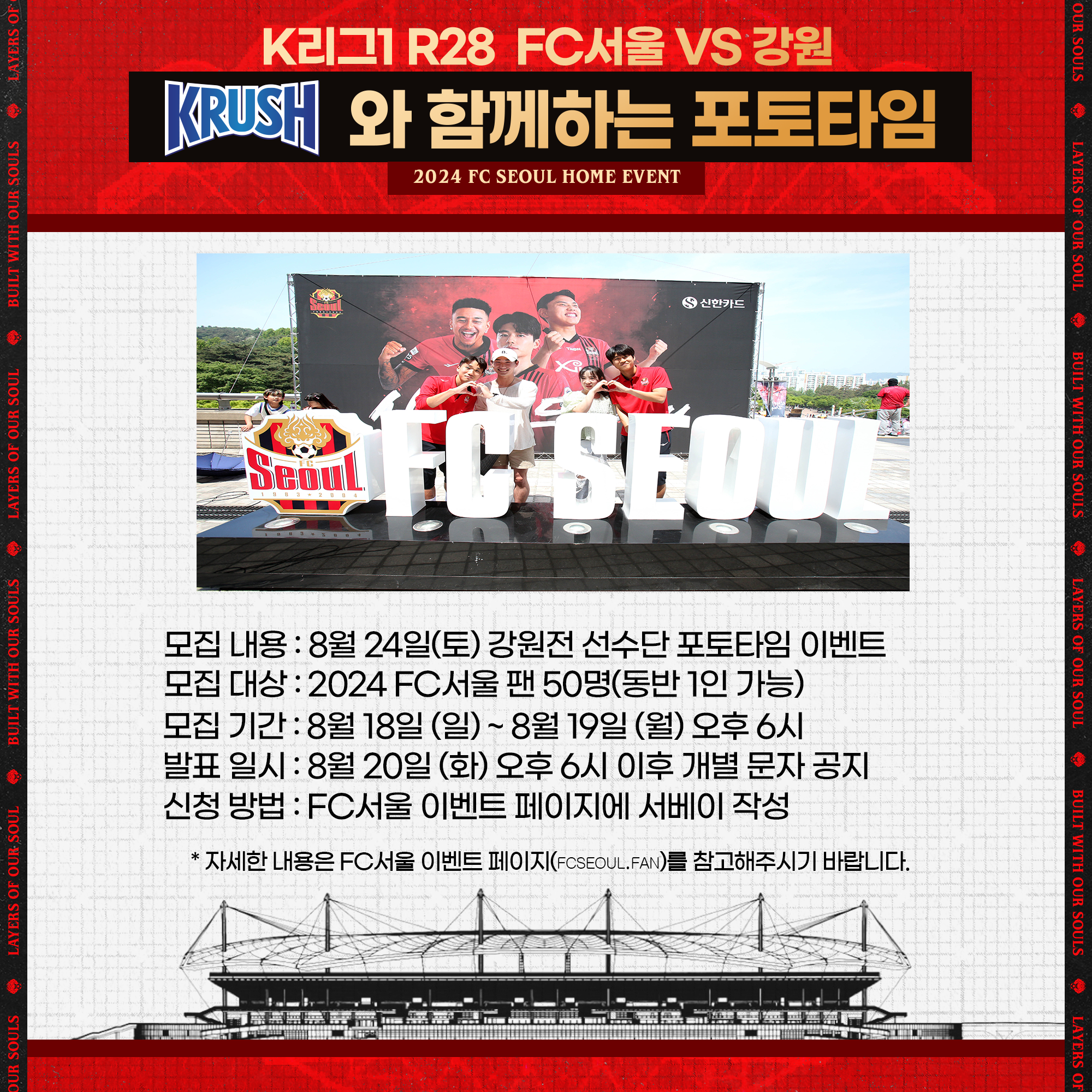 08/24 vs 강원과의 홈경기에서 FC서울 선수들과 함께 사진 촬영을 하는 포토타임 이벤트 참가자를 모집합니다!