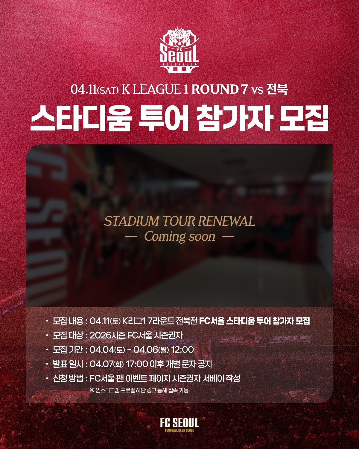 4/11(토) 전북전 '리뉴얼' 스타디움 투어 참가자 모집 (시즌권 회원)